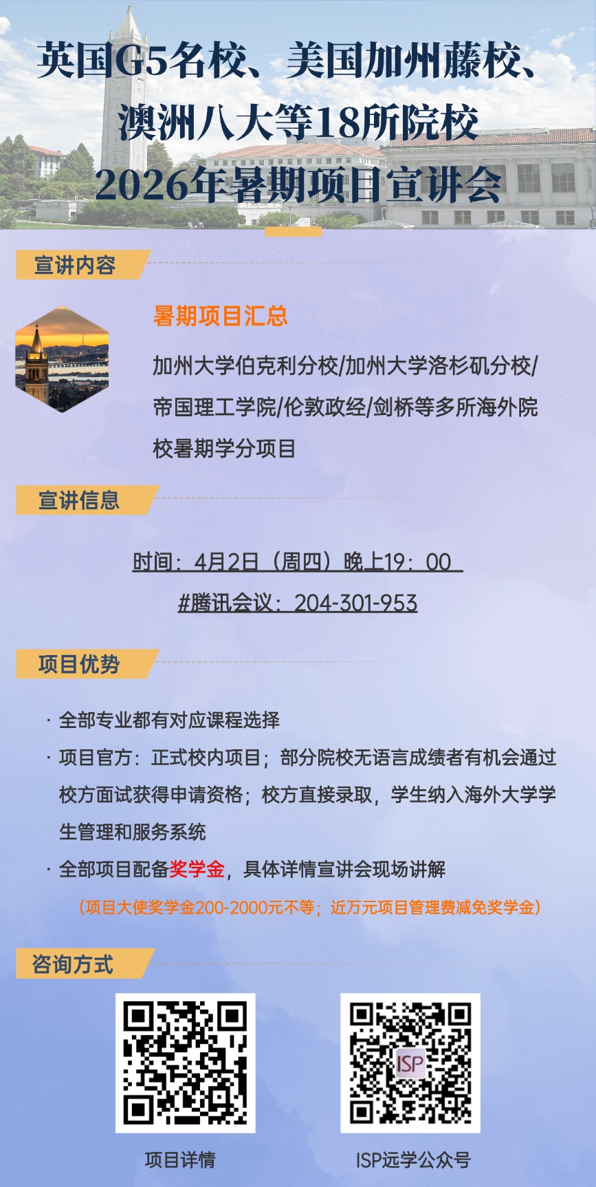 为培养具有国际视野和国际竞争力的高素质人才,ISP远学教育举办2026年赴加州大学伯克利分校、加州大学洛杉矶分校、伦敦大学学院等海外大学暑期项目宣讲会,现将宣讲会的相关事宜通知如下: