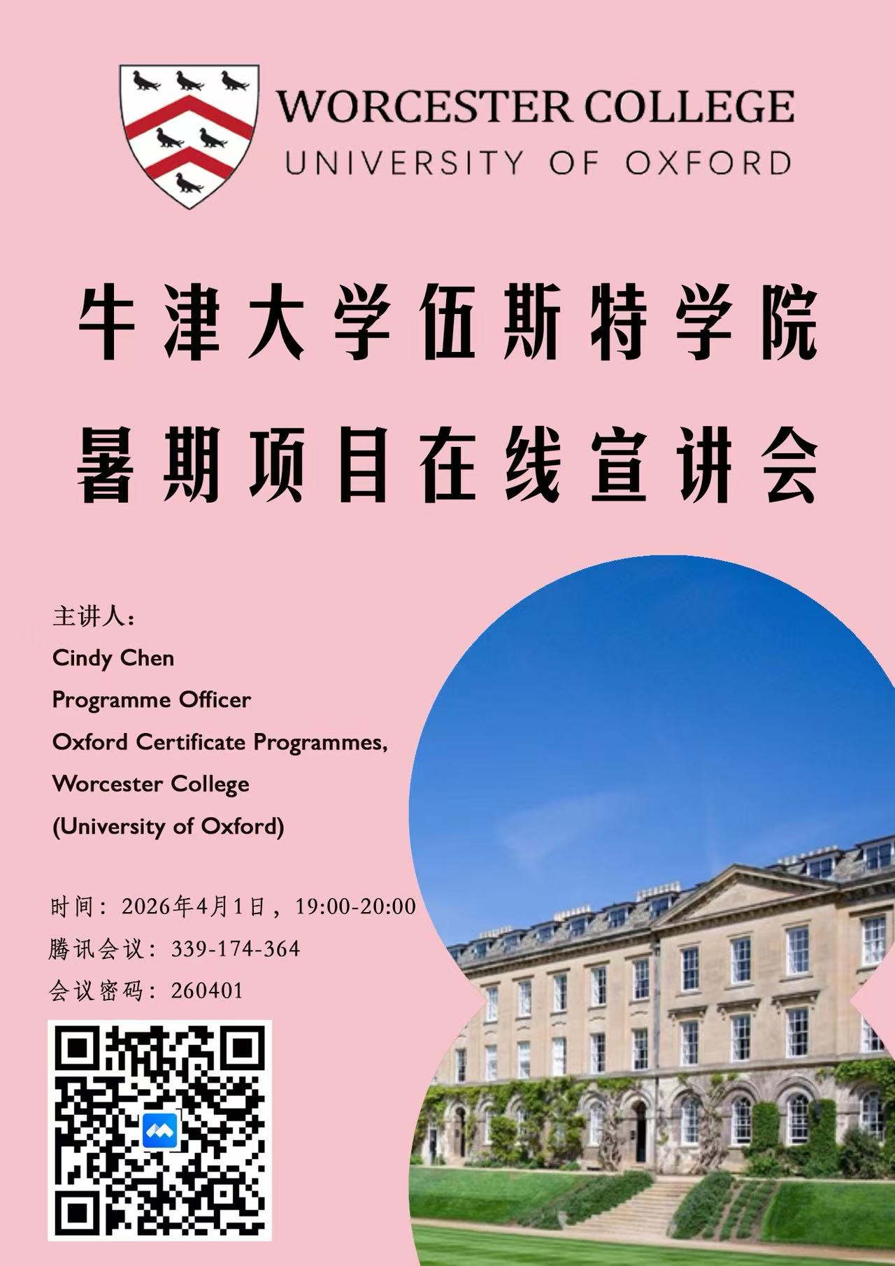 牛津伍斯特学院学院暑期访学项目证书课程负责人Cindy Chen 陈老师将举办线上宣讲会,具体安排如下: