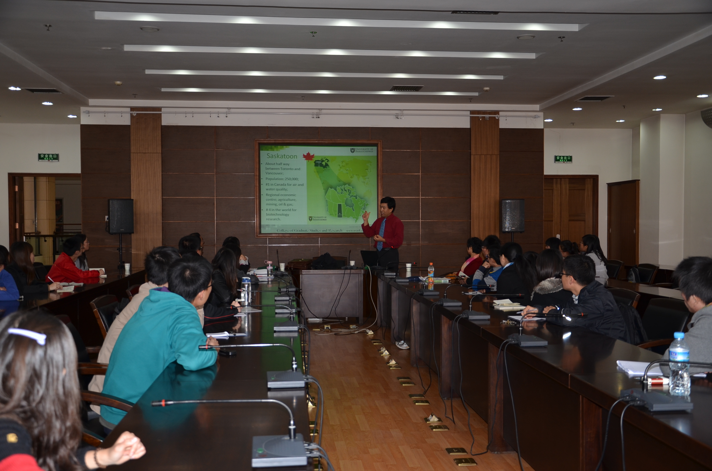 Bingcheng Si教授向同学们详细介绍了加拿大高等教育体制、萨斯卡彻温大学校情校史、加拿大及萨斯卡彻温大学留学准备材料、申请程序等,并回答了同学们在对外联系中遇到的各种问题,受到了热烈欢迎。